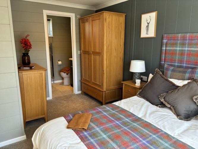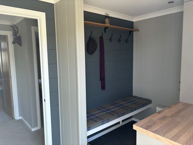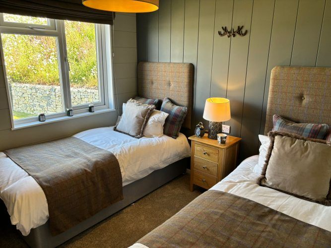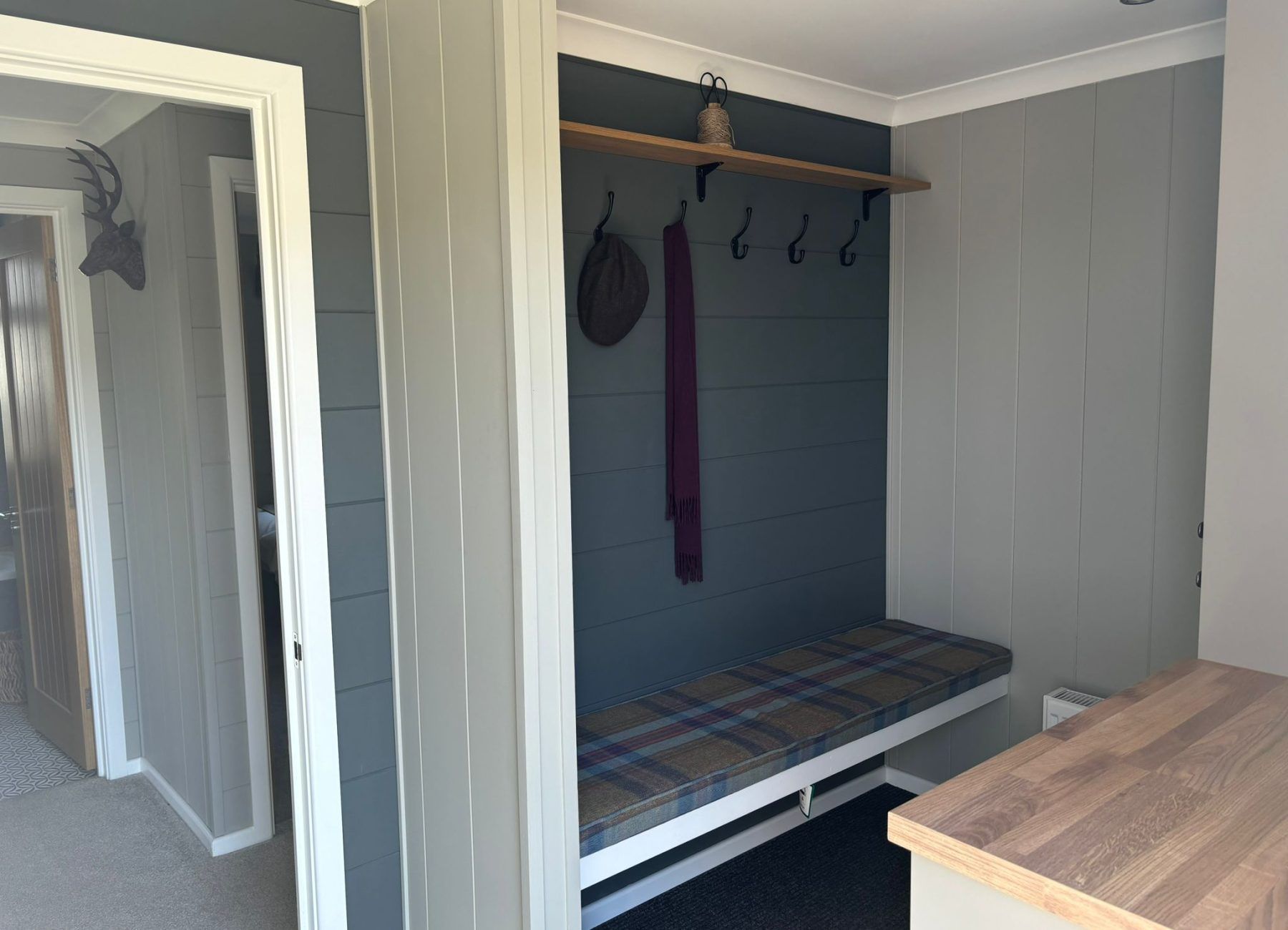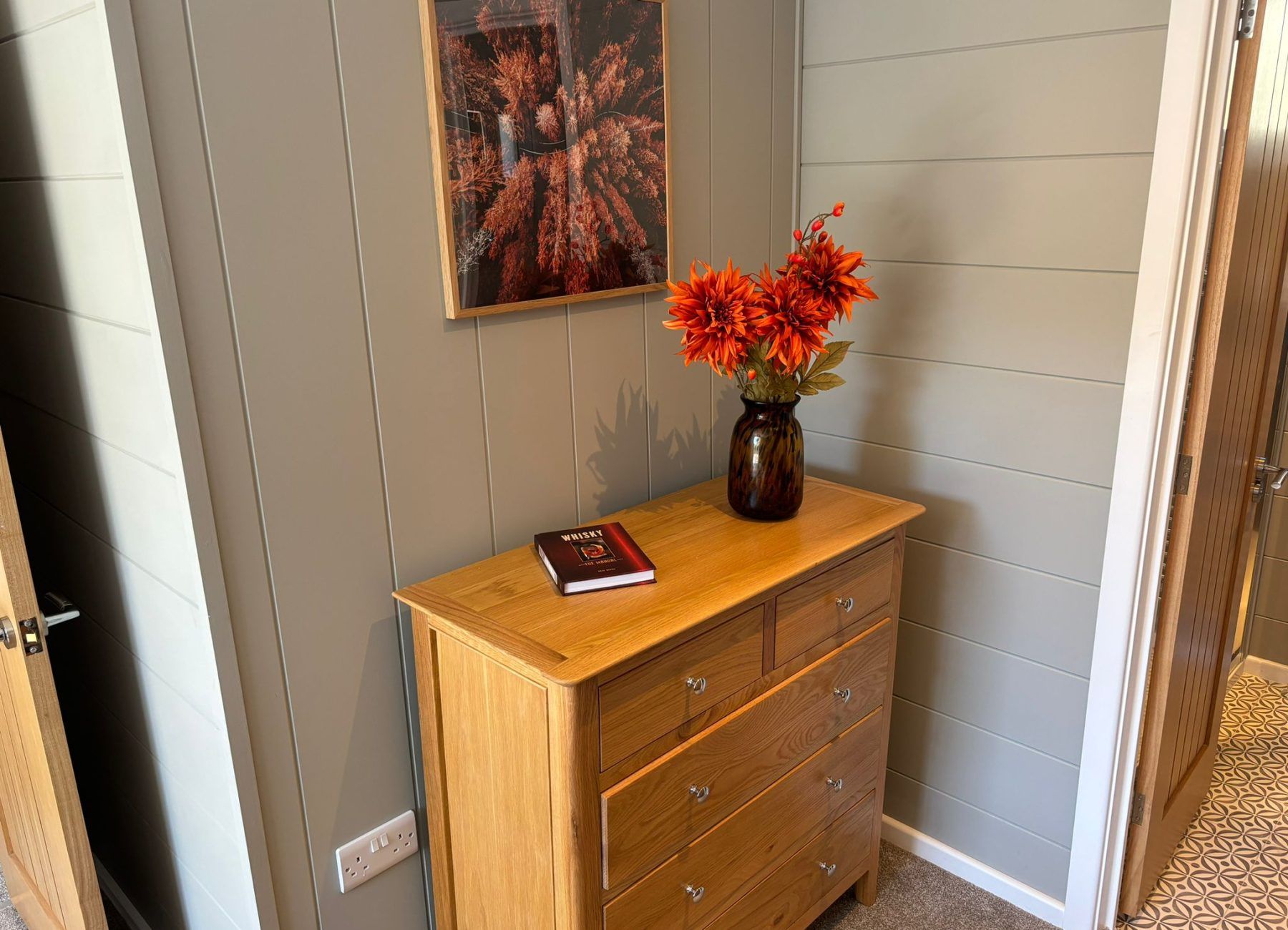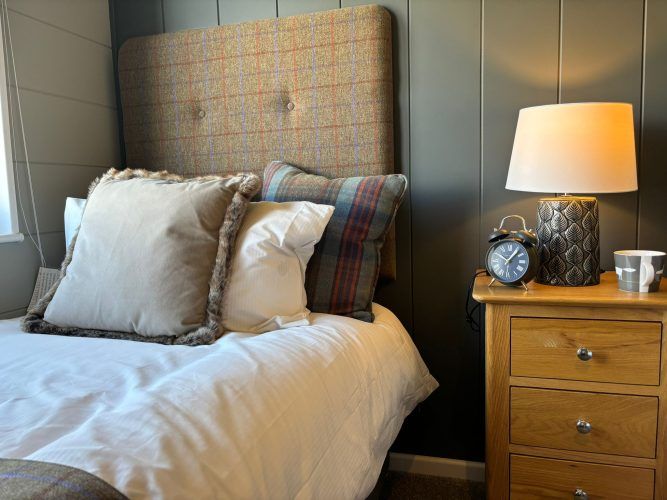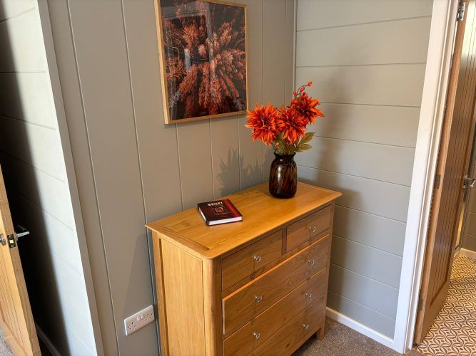 With a vaulted timber ceiling, exposed beams, and a beautiful feature fireplace, it’s easy to imagine returning to this luxury lodge from a long coastal path walk, kicking off your hiking boots, and sinking into the soft and sumptuous sofa, curled up in front of the roaring fire. Practicalities abound too, from the eminently sensible entrance boot room, with its bench seating, ample storage, and tough entrance flooring to the solid oak interior doors and freestanding bedroom furniture. This is truly luxury holiday home living at its best!