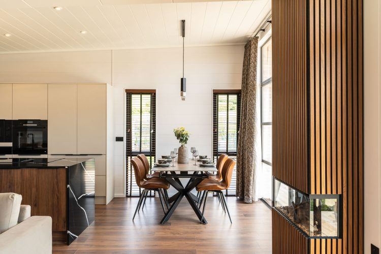 The statement fireplace is sheathed in vertical walnut, drawing one’s eye to the elevated roofline of the holiday home.