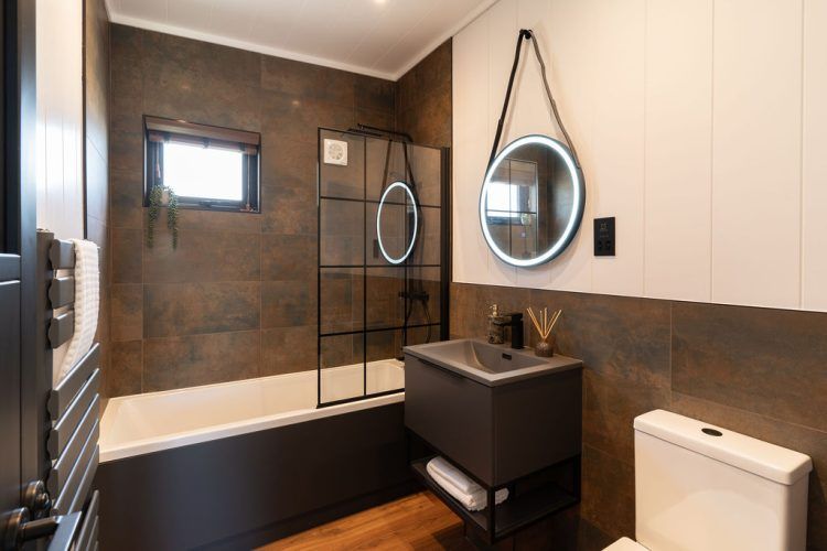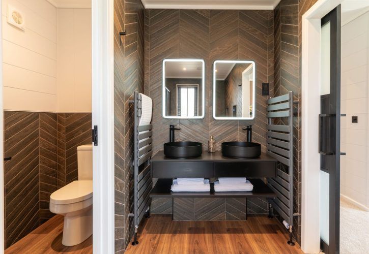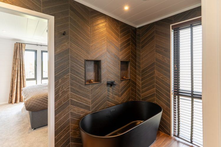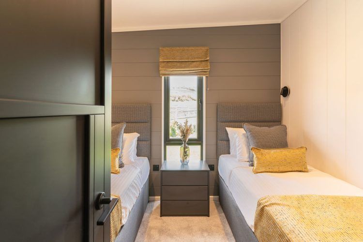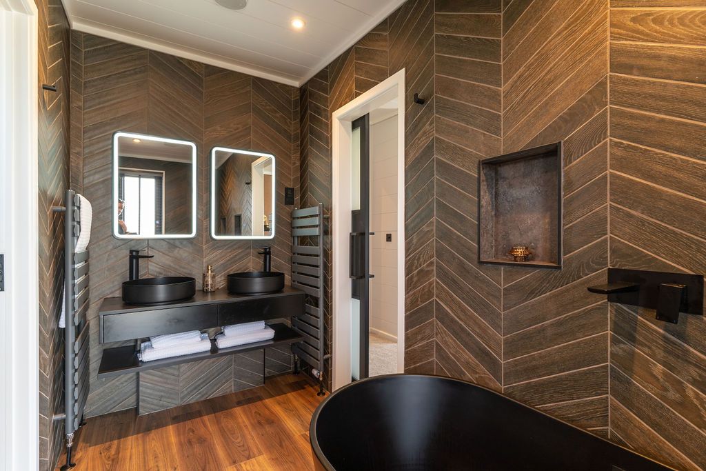 Matte black fixtures – including monsoon showers and twin basins – enhance the indulgently appointed en-suite, ensuring an atmosphere of relaxation and rejuvenation.
