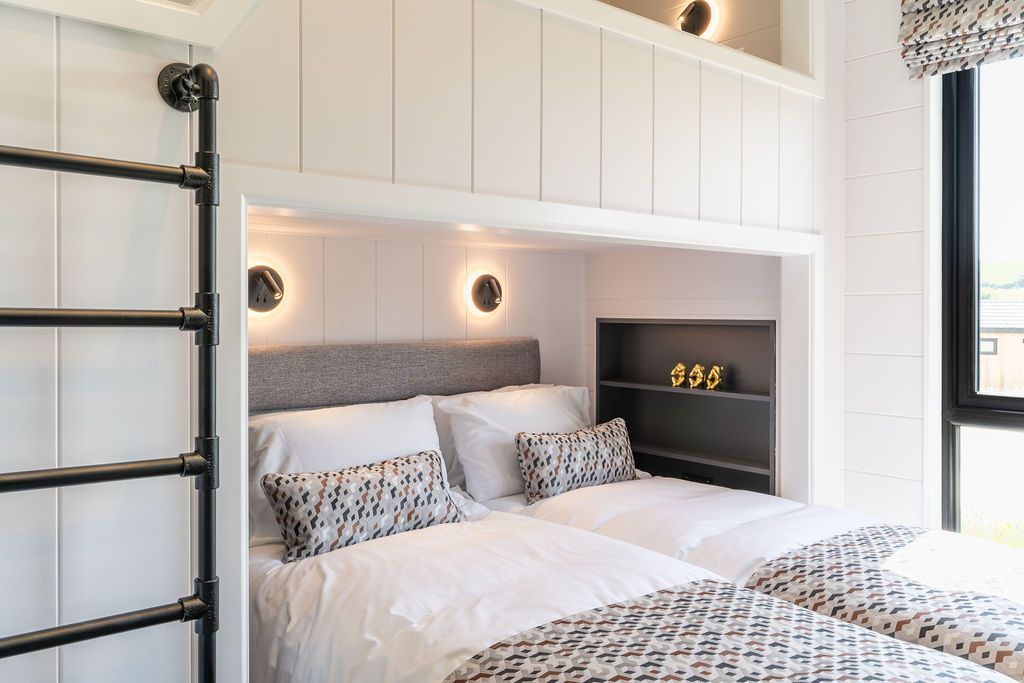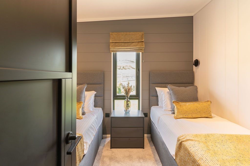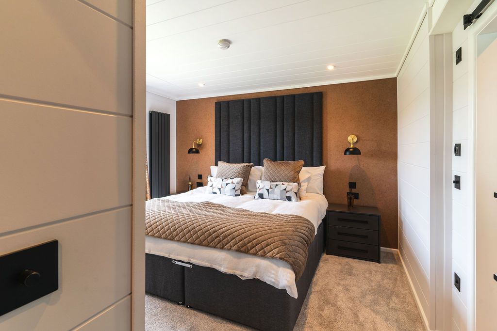 Subtle lighting permeates from the living space through to the bedrooms, where a super king size bed awaits.