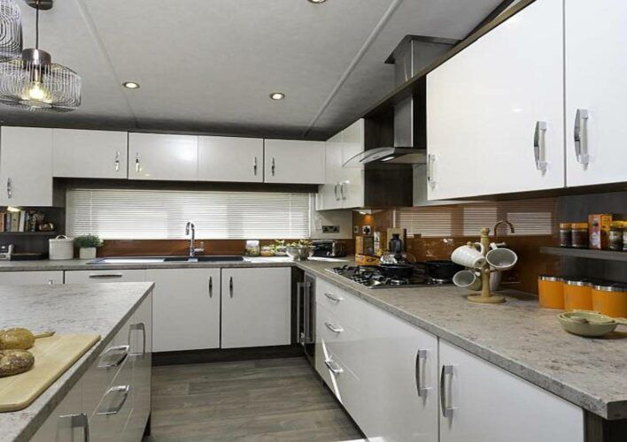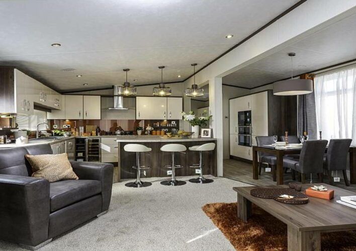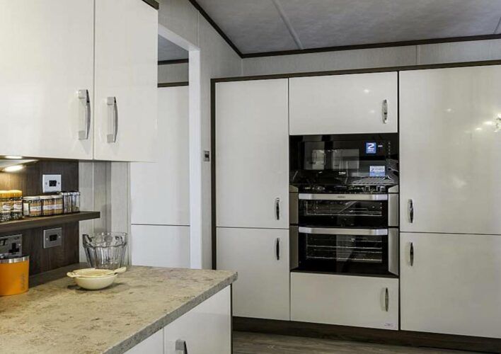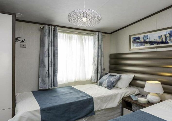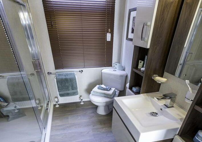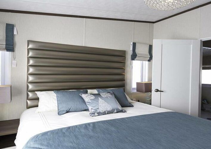 The Arrondale is defined by its nod to contemporary, open plan living with a stunning white gloss kitchen, rust coloured highlights and sleek lounge furniture. The master bedroom has a 5 foot lift up storage bed with a Pemberton luxe mattress combining comfort and functionality. The colour palette is strong and sophisticated with a metallic sheen to the statement headboard and teal coloured curtains. When you walk into the ensuite you find a generous shower and lots of storage.