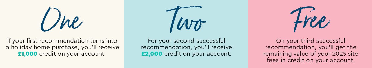Example 1: Current Owner (a) refers recommendation 1 in August. Once sale completed, new owner (1) and current owner (a) receive £1000 each. Current Owner (a) refers recommendation 2 in September. Once sale completed, new owner (2) receives £1000 credit, and current owner (a) receives £2000 credit. Current Owner (a) refers recommendation 3 in October. Once sale complete, new owner (3) receives £1000, and current owner (a) receives remainder of their site fees in credit for that year. Current Owner’s (a) site fees for that year is £5000, therefore once third referral completes, they would receive the remainder of £2000 credit on their account.
