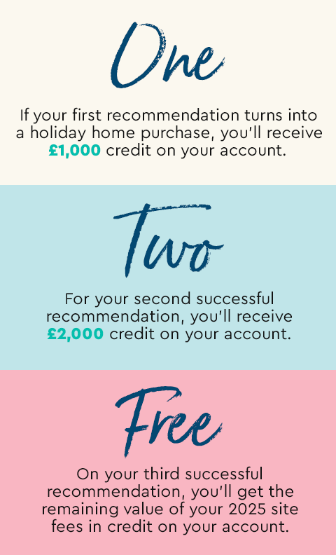 *Scheme can only be redeemed in full once per year. Current scheme is valid until 30th November 2025. You cannot refer yourself, your spouse or your partner. We reserve the right to ask for evidence of your relationship to your referee(s). Only applicable if the caravan owner’s name and caravan number is quoted or a referral voucher is presented at the time of booking an appointment or making the initial enquiry. Vouchers must be brought into the ownership enquiry lounge in order to be redeemed successfully. Not valid in conjunction with any other offer. You must purchase the holiday home directly from Waterside Holiday Group. Corresponding amount credited to the owner referring’s account within 28 days of the purchaser financially completing and handing over. Not valid on part exchange. Only applicable when the form is filled out correctly prior to the Experience Day/enquiry and presented to a sales team member.